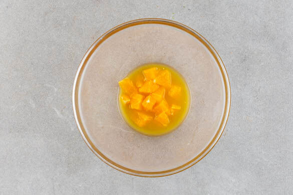 Die Orangen halbieren und eine Hälfte auspressen, die anderen Hälften schälen und das Fruchtfleisch in 0,5–1cm große Stücke schneiden. Die Orangenstücke und den Orangensaft miteinander vermengen.