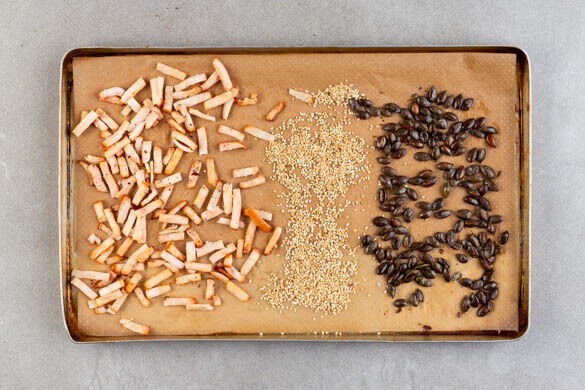 Die veganen Hähnchenschnetzel mit dem Sesam und den Kürbiskernen auf einem zweiten mit Backpapier ausgelegten Backblech verteilen. Mit 2TL Pflanzenöl sowie je 1 kräftigen Prise Salz und Pfeffer vermengen und ca. 10Min. im Ofen backen.