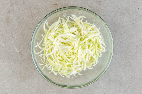 Die Limette halbieren und auspressen. Den Weißkohl mit 2EL Mayonnaise, der ½ des Limettensaftes, je 1 kräftigen Prise Salz und Pfeffer und 1 Prise Zucker vermengen. Beiseitestellen.
