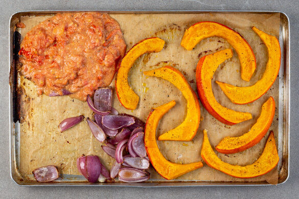 Den Backofen auf 220°C (200°C Umluft) vorheizen. Die Kürbisse halbieren, entkernen und in ca. 1cm breite Spalten schneiden. Die Tomaten halbieren. Die Zwiebeln schälen, halbieren und jede Hälfte in 3 Spalten schneiden.