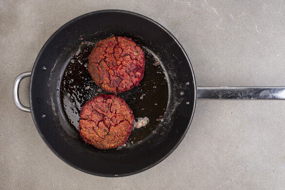 2 gleich große Rote-Bete-Pattys formen und diese in einer mittelgroßen Pfanne mit 1EL Olivenöl bei mittlerer Hitze auf jeder Seite 4–5Min. goldbraun anbraten. Dabei nach dem Wenden ggf. etwas flach drücken und die Hitze reduzieren, falls die Pattys zu schnell bräunen. Nebenher die Burgerbrötchen zu den Karotten aufs Blech geben und 3–5Min. aufbacken.