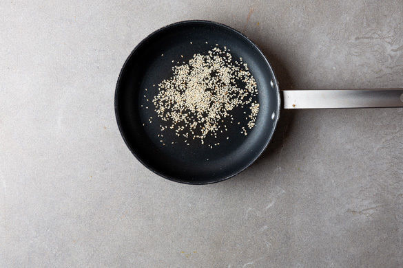 Den Sesam in einer mittelgroßen Pfanne ohne Zugabe von Fett bei mittlerer Hitze 1–2Min. anrösten. Dabei regelmäßig rühren, denn der Sesam kann schnell verbrennen. Zum Abkühlen aus der Pfanne nehmen und beiseitestellen. In einem kleinen Topf ausreichend Wasser für die Zuckerschoten zum Kochen bringen.
