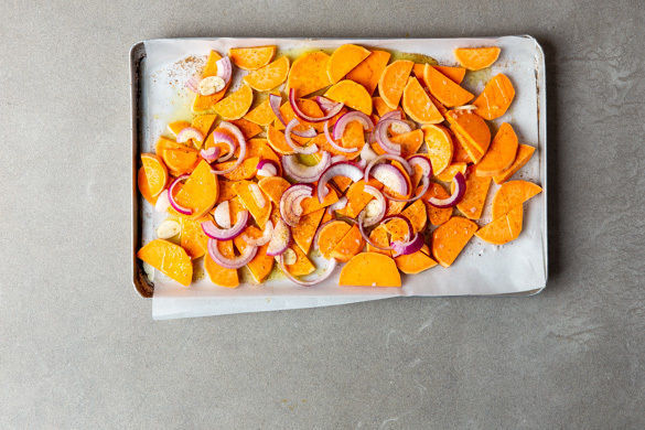 Die Süßkartoffeln, die Zwiebeln und den Knoblauch auf einem mit Backpapier belegten Backblech mit 1EL Olivenöl, der restlichen Gewürzmischung, 1/2TL Salz und Pfeffer nach Geschmack vermengen, gleichmäßig verteilen und 18–20Min. im Ofen rösten.