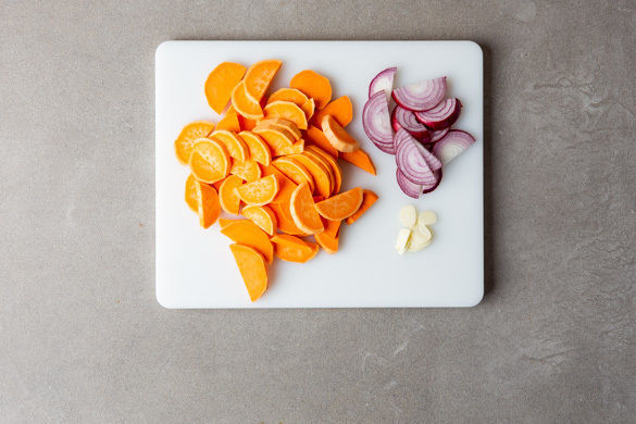 Den Backofen auf 200°C Umluft (220°C Ober-/Unterhitze) vorheizen. Die Süßkartoffel schälen, längs halbieren und in ca. 1cm breite Scheiben schneiden. Die Zwiebel schälen, halbieren und in nicht zu dünne Streifen schneiden. Den Knoblauch schälen und in feine Scheibchen schneiden.