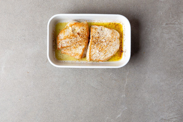 Das Fleisch in einer großen Pfanne bei mittlerer bis starker Hitze auf jeder Seite ca. 2Min. scharf anbraten. In eine Auflaufform geben und im Ofen weitere 5–7Min. garen, bis das Fleisch durch ist. Den Bratensaft in der Pfanne mit 2–3EL Balsamicoessig ablöschen, die 1/2 des Brühgewürzes und 1TL Zucker unterrühren und alles 1–2Min. sanft einkochen lassen.