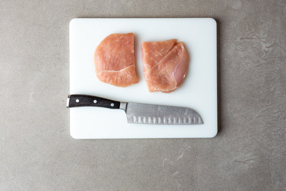Das Fleisch mit etwas Küchenkrepp trocken tupfen, in insgesamt 4 gleich große Stücke schneiden und mit der 1/2 der Gewürzmischung, 1–2EL Olivenöl und 1/2TL Salz vermengen.