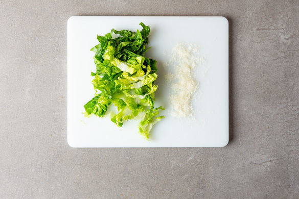 Den Salat in Streifen schneiden, dabei den Strunk entfernen. Den Käse fein reiben.