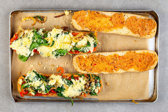 Jede Brötchenhälfte mit 1–2EL der Sauce bestreichen, dann die übrigen Paprikastreifen und die Käse-Spinat-Mischung gleichmäßig auf den unteren Brötchenhälften verteilen und im Ofen 4–5Min. überbacken, bis der Käse geschmolzen ist. Anschließend die unteren Brötchenhälften mit den oberen Brötchenhälften abdecken.