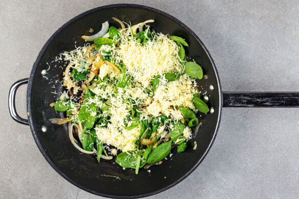 Die Paprika aus der Pfanne nehmen, die ½ des Spinats zu den Zwiebeln geben und bei niedriger Hitze ca. 2Min. garen, bis der Spinat zusammengefallen ist. Den Käse mit dem Spinat und den Zwiebeln verrühren.
