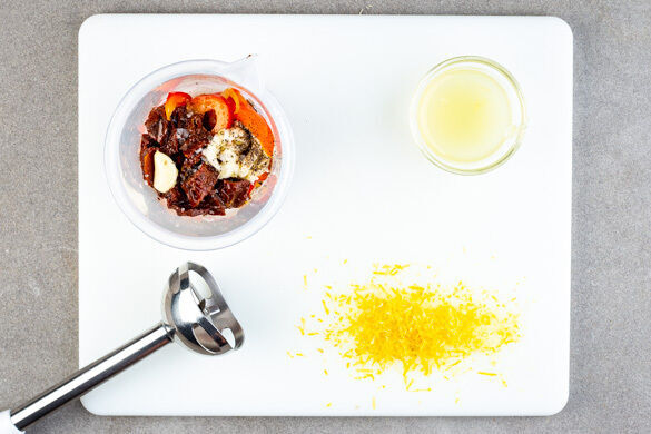 Den Knoblauch schälen. 1TL der Zitronenschale fein abreiben, dann die Zitronen halbieren und auspressen. Die getrockneten Tomaten grob würfeln. Die ½ der Paprikastreifen mit dem Knoblauch, 2EL Zitronensaft, den getrockneten Tomaten, 4EL Mayonnaise und 2EL Olivenöl in einem hohen Gefäß pürieren. Mit Salz und Pfeffer abschmecken.