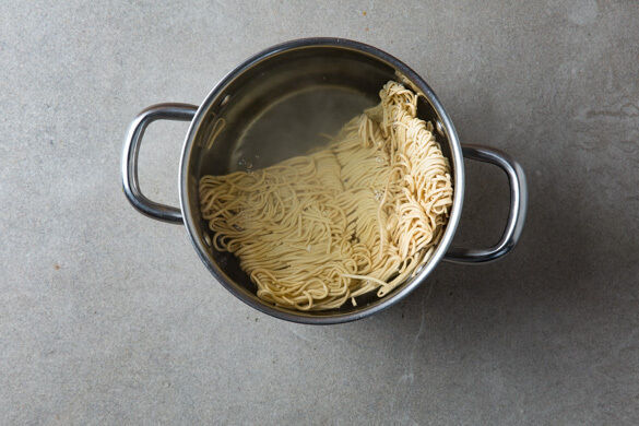 Die Nudeln in das kochende Wasser geben und in 3–5Min. bissfest kochen. In ein Sieb abgießen und abtropfen lassen.