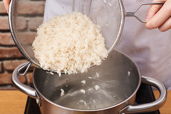 Den Reis in einem Sieb unter fließendem Wasser solange abspülen, bis das Wasser klar bleibt. Sobald das Wasser kocht, den Reis mit einer Prise Salz in den Topf geben, zum Kochen bringen und bei niedrigster Hitze mit einem Deckel ca. 10-12Min. bissfest kochen.
