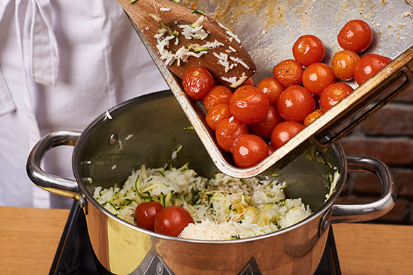 Die Mischung aus Basmati-Reis, geraspelter Zucchini und geschmorten Ofen-Tomaten geht nicht nur ratz-fatz sondern kann sich allemal sehen lassen. Dazu zaubern wir einen leichten Rucolasalat und braten Kräuter-Käse: Der Allgäuer Bratkäse lässt uns von saftigen Blumenwiesen und frischer Bergluft träumen. Einfach köstlich!
