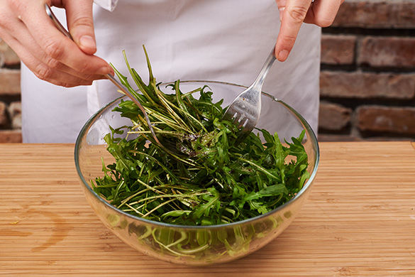 Den Rucola mit 1EL Balsamiocessig, 2EL Olivenöl, Salz und Pfeffer vermischen. Den Reis anrichten, mit dem Salat und dem Käse servieren.