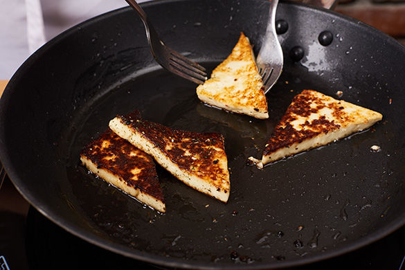 Inzwischen eine Pfanne mit 1-2EL Öl auf mittlere Stufe erhitzen. Den Käse einmal diagonal halbieren und in der Pfanne für ca. 4-5Min. knusprig braten. Kurz vor Ende nach Geschmack Gewürzmischung, die mit dem Käse mitgeschickt wurde, darüber streuen.