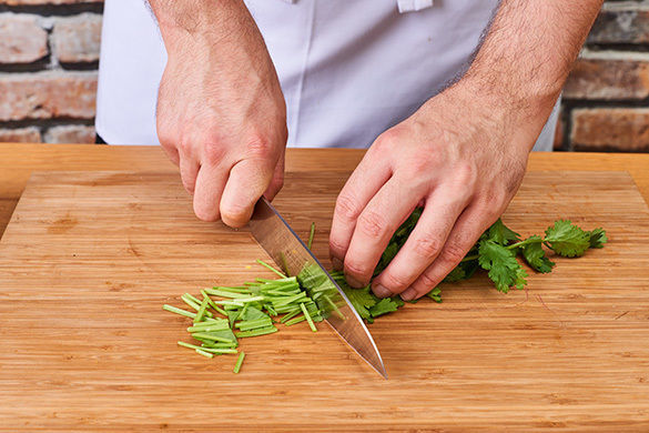 Die Lauchzwiebeln schräg in sehr feine Ringe schneiden. Den Sellerie in ca. 1cm breite Stücke schneiden. Den Knoblauch schälen und in feine Scheibchen schneiden.