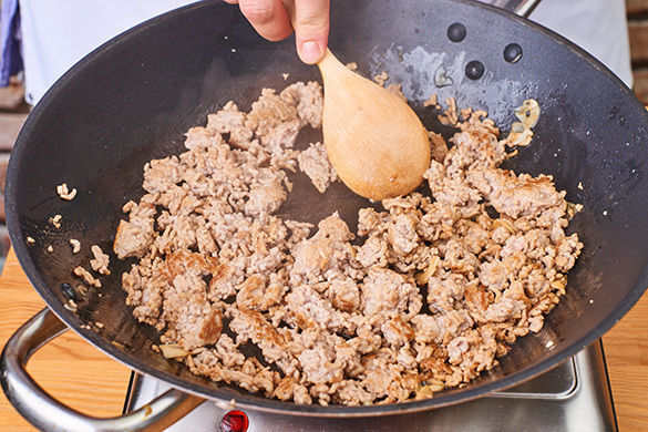 Das Hackfleisch in einem Wok oder in einer großen Pfanne mit 1–2EL Pflanzenöl bei starker Hitze 2–4Min. krümelig anbraten.