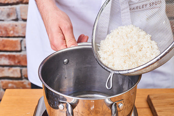 In einem mittelgroßen Topf 300ml leicht gesalzenes Wasser zum Kochen bringen. Den Reis in einem Sieb unter fließendem Wasser abspülen, bis das Wasser klar bleibt. Sobald das Wasser kocht, den Reis hineingeben und abgedeckt bei niedrigster Hitze 10–12Min. kochen, bis das Wasser aufgesogen und der Reis gar ist. Noch ca. 5Min. ohne Hitzezufuhr ziehen lassen.