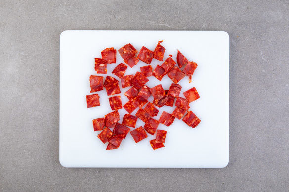 Die Chorizo von der Pelle befreien und in 1–2cm große Stücke schneiden.