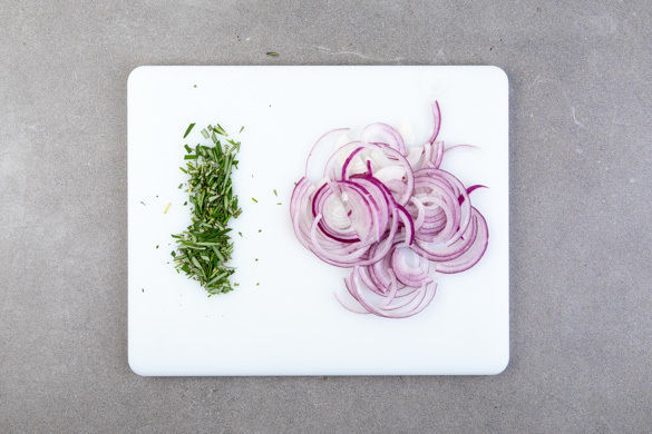 Den Backofen auf 200°C Umluft (220°C Ober-/Unterhitze) vorheizen oder den Grill vorbereiten. Die Zwiebel schälen, halbieren und in dünne Streifen schneiden. Die Rosmarinnadeln abzupfen und grob schneiden.