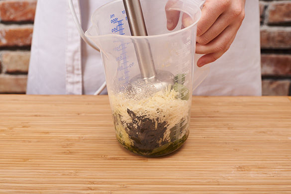Inzwischen den Käse fein reiben und mit den Kräutern, Mandelblättchen und mit ca. 3-4EL Ölivenöl zu einem cremigen Pesto pürieren. Mit Salz und Pfeffer abschmecken.