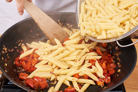 Sobald das Wasser kocht, die Nudeln ca. 8-11Min. bissfest garkochen. Dann das Wasser abgießen und dabei eine Tasse Nudelwasser auffangen. Nudeln in einem Sieb abtropfen lassen.