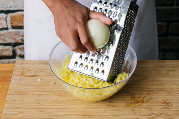 Die Kartoffeln nach Belieben schälen und grob raspeln. Die ganze Zwiebel schälen und ein Ende abschneiden, dann die Zwiebel mit dem anderen Ende in der Hand ebenfalls grob reiben. Das Gemüse anschließend in einem Sieb oder Küchenhandtuch gut auswringen, um überschüssige Flüssigkeit zu entfernen.