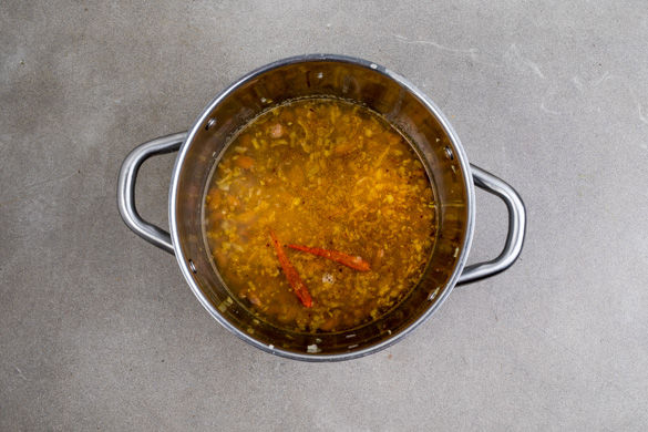 Die Bohnen in ein Sieb abgießen. Die Chilischote längs halbieren, entkernen und mit den Bohnen zu den Zwiebeln geben. Ca. 250ml heißes Wasser angießen und alles ca. 5Min. sanft köcheln lassen. Das Bohnengemüse abgießen, dabei das Kochwasser auffangen. Die gekochten Chilihälften in feine Streifen schneiden.