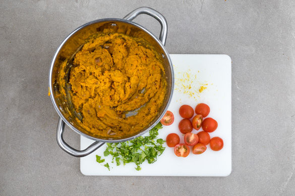 Die gebackenen Süßkartoffeln zum Bohnengemüse in den Topf geben und alles mit einem Stabmixer cremig pürieren, dabei nach Bedarf etwas Kochwasser hinzugeben. Das Dal-Püree mit Salz abschmecken. Die Kirschtomaten halbieren. Die Zitronenschale fein abreiben, dann die Zitrone halbieren und auspressen. Den Koriander samt Stängeln fein schneiden.