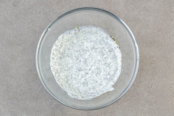 Die ½ der Minzeblätter abzupfen und fein schneiden, dann mit dem Joghurt und 1EL Wasser verrühren. Mit Salz und Pfeffer abschmecken. Tipp: Wer mag, kann auch mehr Minze verwenden.