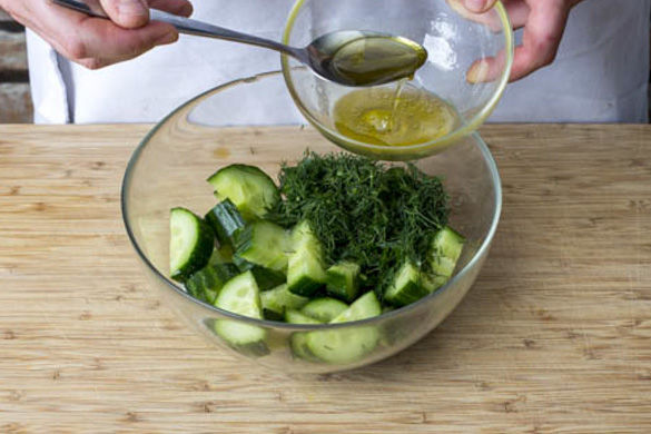 Die Dillspitzen abzupfen, fein schneiden und zu den Gurken geben. Den Salat mit 1EL Pflanzenöl, 1EL Essig sowie Pfeffer und Zucker abschmecken und bis zum Servieren ziehen lassen.