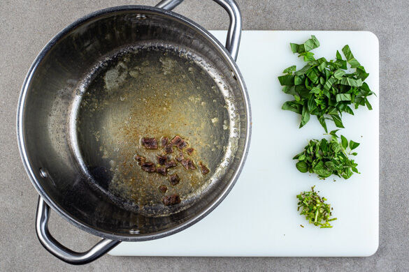 Die ½ der Sardellen fein schneiden. Die Basilikum- und Oreganoblätter von den Stängeln zupfen und separat grob schneiden, die Stängel fein schneiden. Die Sardellen in einem mittelgroßen Topf mit 1EL Butter bei niedriger Hitze in 2–3Min. schmelzen lassen, ohne die Butter zu bräunen.
