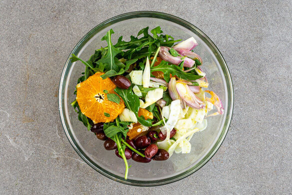 Den Fenchel vierteln und in hauchdünne Streifen schneiden, dabei den harten Strunk entfernen. Die Schalotte schälen, halbieren und in dünne Streifen schneiden. Die Orangen mit einem Messer schälen, dabei auch die weiße Haut entfernen. Das Fruchtfleisch in ca. 1cm breite Spalten schneiden. Die Zutaten mit den Oreganoblättern, den Oliven und dem Dressing vermengen.