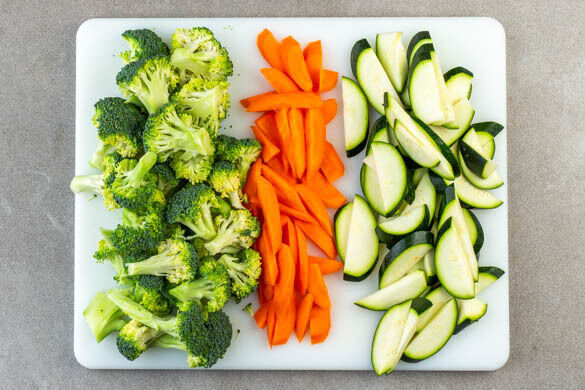 Den Brokkoli in mundgerechte Röschen zerteilen, den Strunk ggf. schälen und in ca. 1cm große Würfel schneiden. Die Karotten ggf. schälen, dann die Karotten und die Zucchini längs halbieren und schräg in dünne Scheiben schneiden.