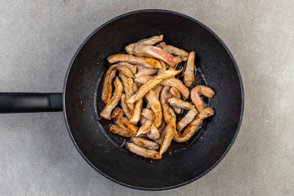 Das Fleisch in einer großen Pfanne oder einem Wok mit 1EL Pflanzenöl bei starker Hitze in 2–3Min. gar braten, mit 1 Prise Salz würzen und aus der Pfanne nehmen.