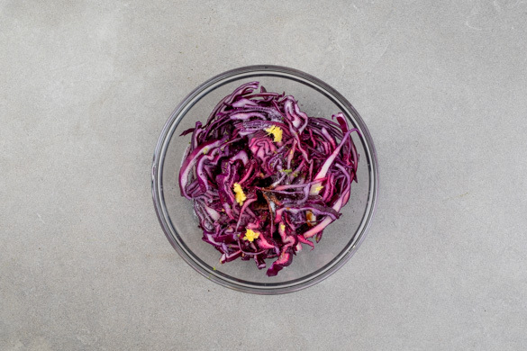 Den Rotkohl in möglichst feine Streifen schneiden, dabei den Strunk entfernen. In eine Schüssel geben und mit dem Limettensaft und der ½ der Limettenschale vermengen. Die ½ der Teriyakisauce, 2EL Pflanzenöl und Ingwer nach Geschmack zugeben, mit je 1 kräftigen Prise Zucker und Salz würzen und alles gut mit den Händen gut verkneten. Den Salat mit 2EL Essig abschmecken.