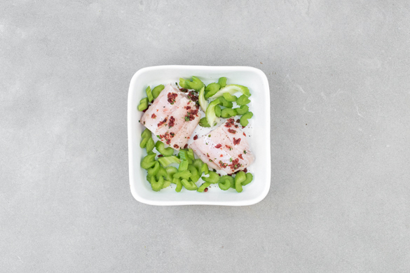 Den Stangensellerie schräg in dünne Scheiben schneiden und mit in die Auflaufform geben. Im Ofen 15–20Min. backen, bis der Fisch in der Mitte gar ist.