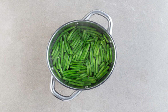 In einem kleinen Topf ausreichend gesalzenes Wasser für die Bohnen zum Kochen bringen. Die Enden der Bohnen entfernen, dann die Bohnen halbieren und in ca. 10Min. bissfest kochen. In ein Sieb abgießen, zurück in den Topf geben und mit sehr kaltem Wasser bedecken, damit sie abkühlen.