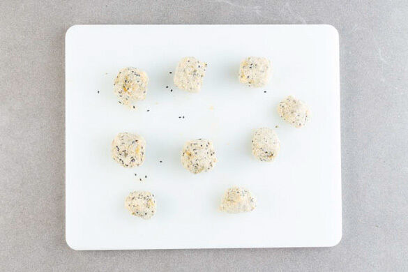 Den Camembert in ca. 2cm große Stücke schneiden und in der ½ der Stärke wenden. Die Sonnenblumenkerne in einem Plastikbeutel zertrümmern und mit der restlichen Stärke, dem Sesam sowie je 1 Prise Salz und Pfeffer vermengen. 1 Ei verquirlen und die Camembertstücke im Ei und dann in der Stärke-Sesam-Mischung wenden. Den Vorgang noch einmal wiederholen.