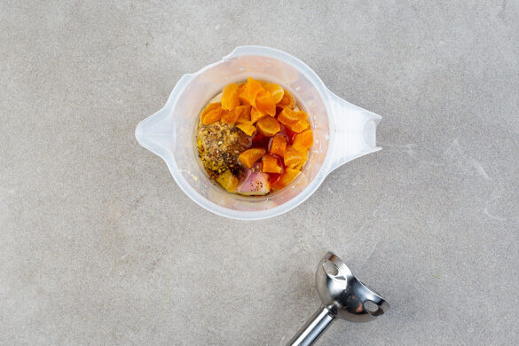 Die ½ der Schalotte schälen, halbieren und grob würfeln. Tipp: Wer mag, kann auch die gesamte Schalotte verwenden. Mit 1½EL Olivenöl, 1½EL hellem Essig, 1EL körnigem Senf, 1TL Sweet-Chili-Sauce und je 1 Prise Salz und Pfeffer in ein hohes Gefäß geben und mit einem Stabmixer zu einem cremigen Dressing pürieren.