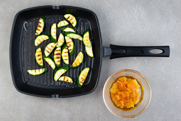 Die Zucchini längs halbieren, in ca. 1cm dicke Scheiben schneiden und mit 1EL Olivenöl sowie je 1 Prise Salz und Pfeffer vermengen. Dann in einer Grillpfanne oder großen Pfanne auf beiden Seiten 4–6Min. grillen oder anbraten.