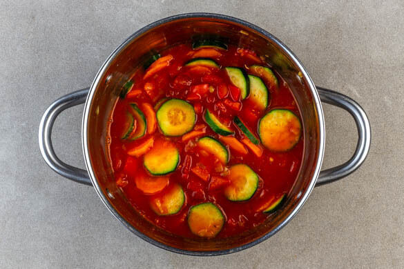Das Brühgewürz und das heiße Wasser aus dem Wasserkocher in den Topf geben und gut rühren, damit sich das Gemüse vom Topfboden löst.