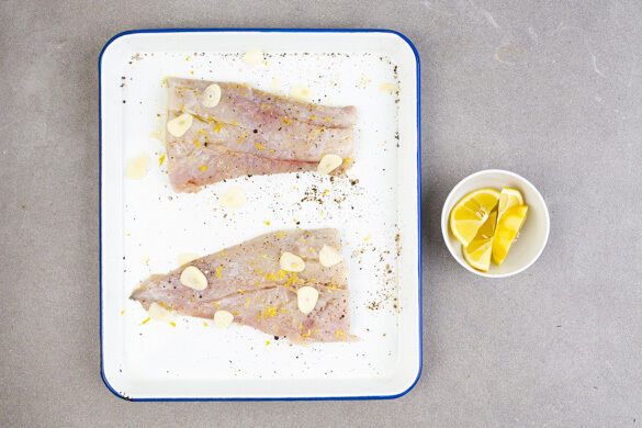 Den Fisch kalt abspülen, trocken tupfen und evtl. vorhandene Gräten entfernen. Rundum mit 2EL Öl einreiben. Die Zitronenschale abreiben und die Zitrone halbieren, 1 Hälfte auspressen, die übrige Hälfte in Spalten schneiden. Den Fisch in einer Auflaufform mit 1EL Zitronensaft beträufeln, mit Salz, Pfeffer und 1TL Zitronenschale würzen, den Knoblauch verteilen.