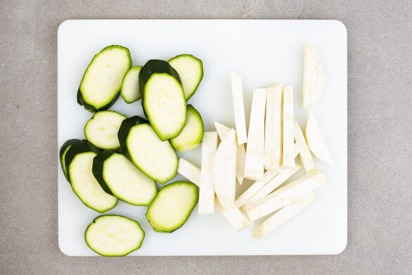 Den Backofen auf 240°C (220°C Umluft) vorheizen. Den Knollensellerie schälen und in ca. 1cm dünne Scheiben, dann in ca. 1cm dünne Stifte schneiden. Die Zucchini schräg in ca. 1cm dicke Scheiben schneiden.