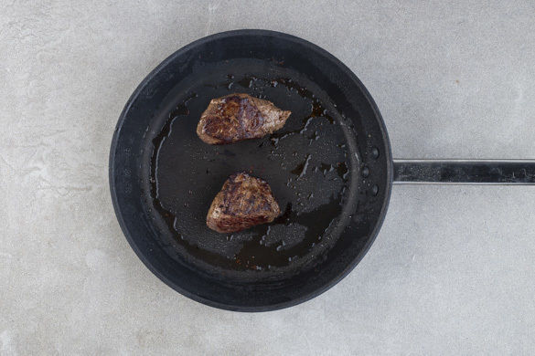 Das Fleisch mit etwas Küchenkrepp trocken tupfen und mit Salz und Pfeffer würzen. In einer mittelgroßen Pfanne mit 1–2EL Olivenöl bei starker Hitze auf beiden Seiten ca. 1Min. scharf anbraten, dann in eine Auflaufform geben und im Ofen 5–7Min. nachgaren, bis das Fleisch in der Mitte noch leicht rosa ist. Die Pfanne aufbewahren.