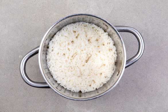 In einem mittelgroßen Topf 400ml leicht gesalzenes Wasser zum Kochen bringen. Den Reis in einem Sieb unter fließendem Wasser abspülen, bis das Wasser klar bleibt. Den Reis in das kochende Wasser geben und bei niedrigster Hitze abgedeckt 10–12Min. kochen, bis das Wasser aufgesogen und der Reis gar ist. Noch ca. 5Min. ohne Hitzezufuhr abgedeckt ziehen lassen.