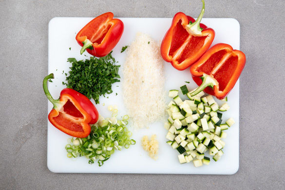 Den Backofen auf 180°C Umluft (200°C Ober-/Unterhitze) vorheizen. Die Paprika halbieren und das Kerngehäuse entfernen. Die 1/2 der Zucchini in kleine Würfel schneiden. Den Knoblauch schälen und fein würfeln. Die Lauchzwiebel in dünne Ringe schneiden. Die Petersilienblätter abzupfen und fein hacken. Den Käse fein reiben.