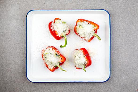 Die Zucchiniwürfel und die 1/2 des Knoblauchs in einer mittelgroßen Pfanne mit 1EL Olivenöl bei mittlerer Hitze 2–3Min. anbraten, dann mit dem Reis, den Lauchzwiebeln und der 1/2 der Petersilie mischen und mit Salz und Pfeffer würzen. Den Gemüsereis in die Paprikahälften füllen, diese in eine Auflaufform geben, mit Käse bestreuen und 15–20Min. im Ofen backen.