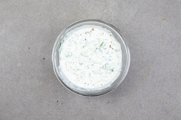 Die Zitronenschale abreiben, dann die Zitrone halbieren und auspressen. Die 1/2 einer Gurke grob reiben und leicht auspressen. Die Dillspitzen abzupfen und fein schneiden. Den Joghurt mit dem restlichen Knoblauch, den Gurkenraspeln und der 1/2 des Dills verrühren und das Tzatziki mit Zitronenabrieb, Zitronensaft, Salz und Pfeffer abschmecken.