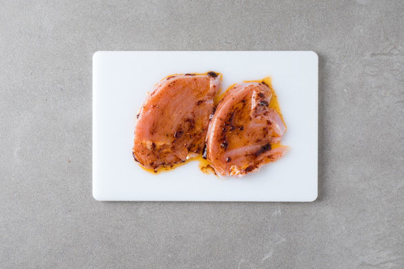 Eine Grillpfanne auf mittlerer Stufe erwärmen und die Schnitzel auf jeder Seite 1–2Min. grillen. Evtl. ein wenig mehr Öl dazugeben, falls die Pfanne keine Antihaftbeschichtung hat. Das Fleisch von beiden Seiten mit der restlichen BBQ-Sauce bestreichen, in eine Auflaufform geben und weitere 3–4Min. im Ofen garen, bis das Fleisch durch ist.